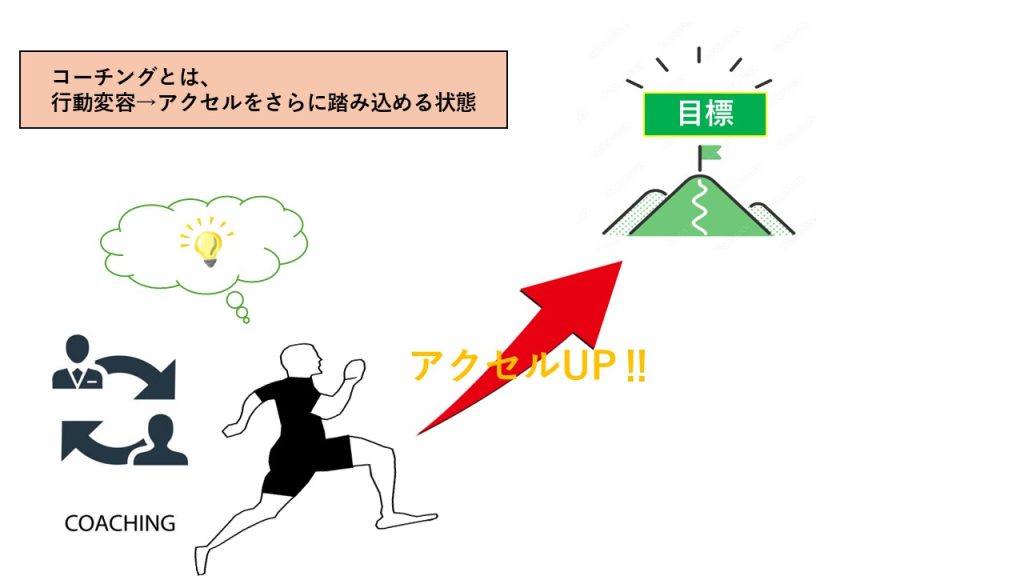 コーチングは、目標達成に向けて、質問やワークを通して相手の中にあるリソース(経験・強み・価値観など)を引き出し、目標に進む力=”アクセル”(行動)を強めていくサポートです。